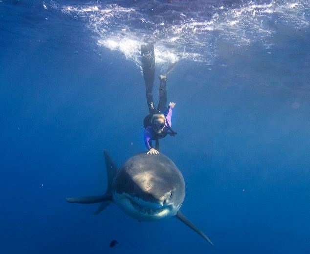 Fotograful Juan Oliphant a surprins momentul în care un exemplar masiv, lung de peste cinci metri, din specia Marele Alb, se lasă mângâiat pe spate şi o duce pe Ramsey în adâncuri. Tânăra se răsuceşte în apă, apoi se îndreaptă spre rechin şi se prinde de spatele lui, iar acesta o poartă docil după el.