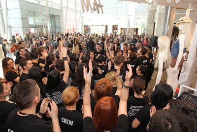 Cei 60 de angajaţi ai magazinului au dansat şi au transformat aşteptarea clienţilor într-un eveniment festiv.