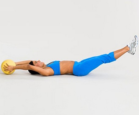 Întinde-te cu spatele pe podea şi cu mâinile deasupra capului. Ridică încet trunchiul şi picioarele şi apoi revino în poziţia iniţială. Repetă de 20 de ori.