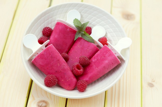 Ai nevoie de: 1 iaurt grecesc, un pumn de zmeură proaspătă, puţin lapte (de vacă sau vegetal) şi puţină miere de albine. Se toarnă compoziţia în formele pentru îngheţata pe băt şi se lasă la congelator câteva ore.