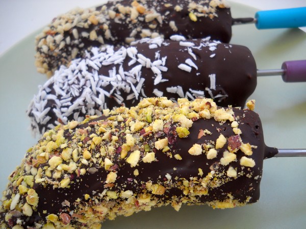 Bananele se taie în două şi se pun pe beţe pentru îngheţată. Se introduc într-o pungă şi se lasă la congelator peste noapte.