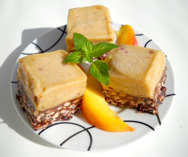 Între timp am mixat în robotul de bucătărie bananele congelate cu piersica şi am turnat îngheţata peste blatul crocant.