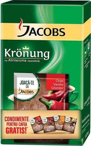 Mixurile sunt disponibile impreuna cu pachetele Jacobs Kronung Cafea prăjită și măcinată.