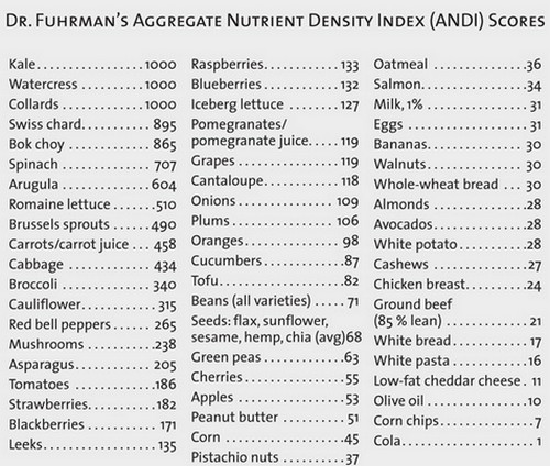 Acest lucru presupune să alegi alimente nutritive, care asigură substanţele necesare organismului. Aceste alimente au un conţinut caloric scăzut, prin urmare te vor ajuta şi să slăbeşti pe lângă protecţia pe care o oferă împotriva bolilor. În această categorie intră legumele şi fructele în culori cât mai variate. Un exemplu pe care îl oferă dr. Joel Fuhrman în sprijinul acestei idei este acela că legumele cu frunze de un verde închis ajută la digestie, iar fructele de pădure conţin nutrienţi care protejează inimă şi ne feresc de cancer. Vezi mai jos un tabel cu cele mai nutritive alimente recomandate de dr. Joel Fuhrman!