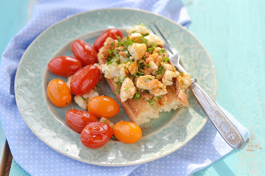 Se scurge tofu, se fărâmiţează şi se pune într-o tigaie cu 1 linguriţă de ulei. Se presară peste ea praf de curry pentru a-i da o savoare şi se lasă puţin la călit (5 minute), amestecând-o des cu o lingură de lemn. Se adaugă apoi puţină ceapă şi ardei, ambele tocate mărunt şi se mai lasă la călit încă 5 minute până se îmbină aromele. Opţional poţi să adaugi câteva felii de ciuperci şi verdeaţă.