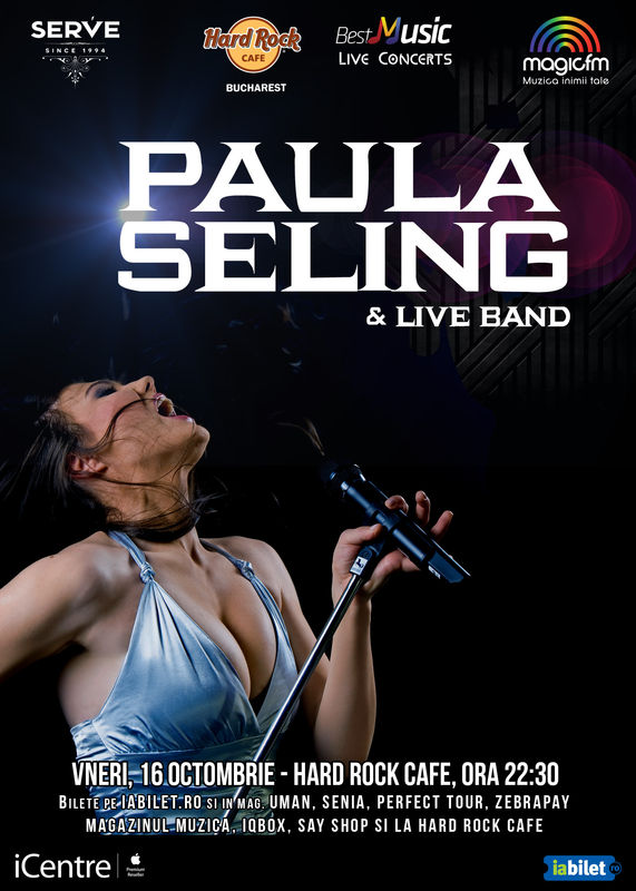 Vineri, 16 octombrie, de la ora 22:30, BestMusic Live Concerts te invită la Hard Rock Cafe la un show cu PAULA SELING şi trupa sa. Te aşteptăm să asculţi cele mai cunoscute piese lansate de artistă de-a lungul carierei: „Ploaie în luna lui Marte”, “Ce bine că eşti”, “Trurli”, “Timpul”, “Promit”, “Râd cand imi vine să plâng,” dar şi mult mai recentele “Playing With Fire” şi “Miracle”.