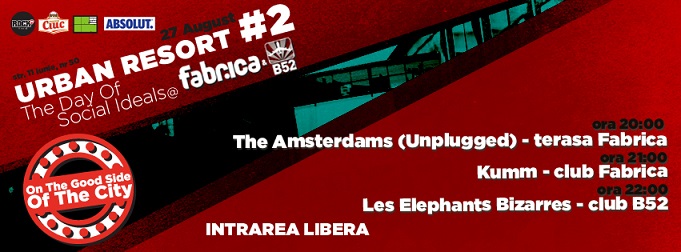 Evenimentul Urban Resort #2: The Day Of Social Ideals va reuni maine (miercuri, 27 august), pe parcursul a 24 de ore, sub palaria Club Fabrica & B52: LIVE Music, Funky Shops, Good Fun, Food & Drinks, Kids Area si After Party, timp de o zi si o noapte, de miercuri dimineata pana joi.Programul concertelor LIVE: