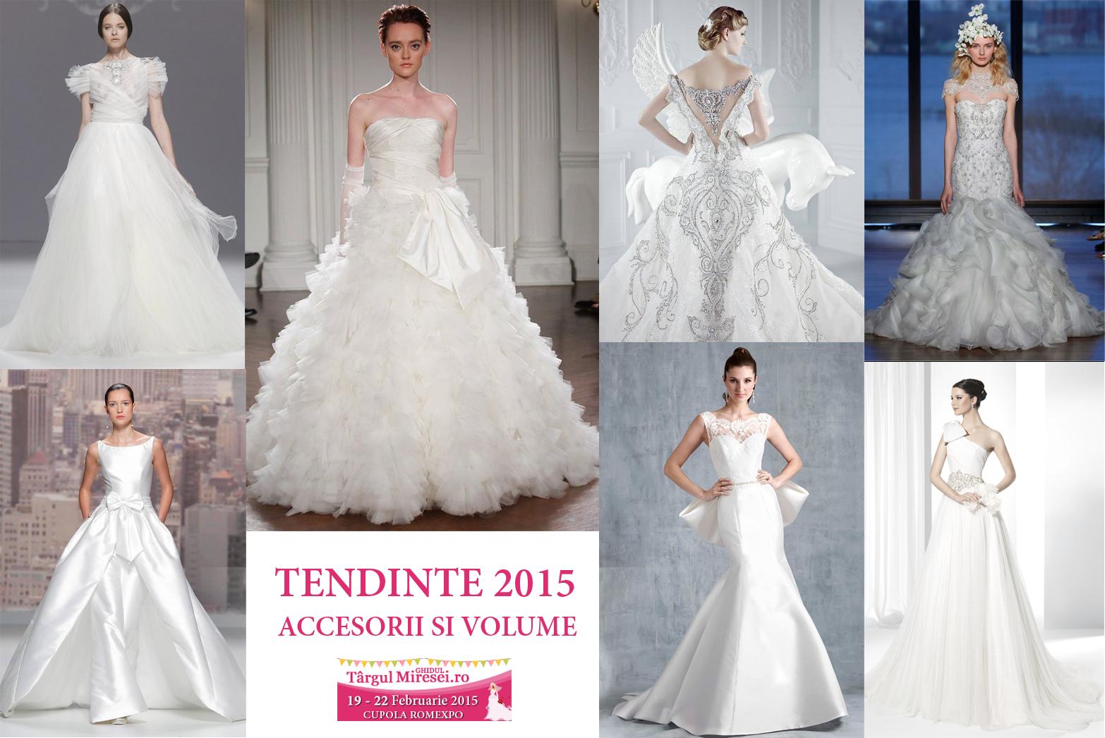 ACCESORII SI VOLUME. Rochia clasica de printesa prinde forme si aripi noi prin introducerea accesoriilor voluminoase, a formelor exagerate si a decupajelor inedite. Vorbim aici de funde XXL plasate pe spatele rochiei, pe talie sau pe un umar, brose vintage cu un volum excesiv, forme inedite ce imita scorpionul sau paunul si coliere din pietre semipretioase cusute in corsetul rochiei de mireasa. Tulul este textura anului, conferind volum si suplete rochiei, dar si un aer romantic si senzual miresei.
