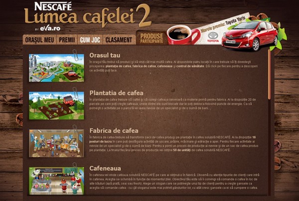 Fii manager în industria cafelei şi vei avea o plantaţie, o fabrică şi o cafenea pe care să le dezvolţi la maximum! Premiile sunt pe măsură! Concursul se desfăşoară în perioada 6 noiembrie 2012 - 31 ianuarie 2013. Succes!