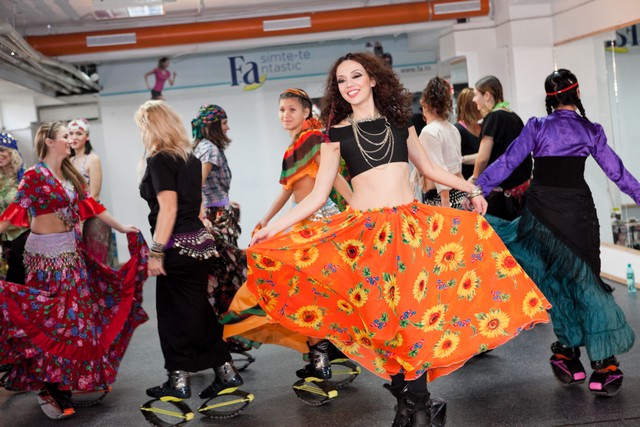 Ca trainer personal apelez tot timpul la antrenamente diversificate. Asta am făcut şi cu evenimentele. Ne-am antrenat în costum naţional, în culori aprinse, purtând coroniţe cu flori. Am făcut kangoo jumps în acorduri rock, am apelat la costume bărbăteşti, la “jumping in men’s clothes”, am purtat costume ţigăneşti şi am sărbătorit Crăciunul în sală.