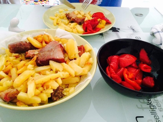 "Văru' Titi și a lui Ro m-au invitat la carne din borcan cu cartofi prăjiți și murături! Așa duminică... mai rar! Nu mai pot să scriu că mor de poftă... Poftă bună, tuturor:-)!", a scris vedeta.
