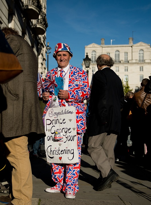 Printre susţinătorii excentrici ai monarhiei britanice se numără şi Terry Hutt, în vârstă de 77 de ani, supranumit "The Union Jack Man" datorită ţinutelor sale vestimentare, care se plimba miercuri prin faţa palatului Saint James cu un poster uriaş conţinând mesaje de felicitare, peste care lipise cu bandă adezivă o răţuşcă de baie.