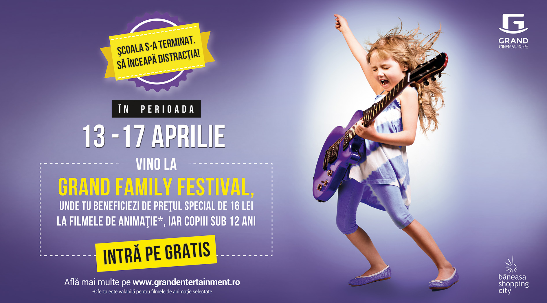 Grand Family Festival,festivalul de film pentru întreaga familie, revine la Grand Cinema & More înperioada 13 – 17 aprilie. Aflat la cea de-a șaptea ediție, evenimentul oferă copiilor sub 12 ani acces gratuit la cele mai îndrăgite filme de animație și un preț special de 16 lei pentru însoțitorii lor. Grand Family Festival este prima opțiune de distracție pentru părinți și copii, cand vine vorba despre petrecea timpul împreună, în perioada vacanței inter-semestriale.