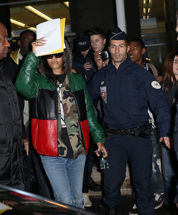 Rihanna a ajuns sâmbătă după amiază în capitala Franței, în cadrul turneului ei, intitulat "777 Tour". Ea a fost preluată de la aeroportul Roissy de polițiștii francezi, care i-au ținut la distanță pe curioși, și a mers direct la cumpărături.