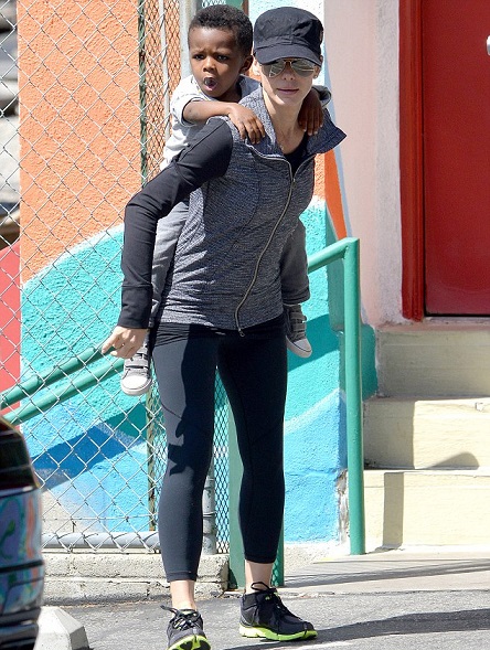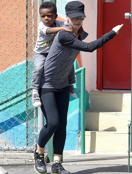 Îmbrăcată sport, bluză gri cu fermoar, pantaloni negri mulați și încălțată cu pantofi sport, actrița în vârstă de 48 de ani purta o șapcă și oechalari de soare. ea a renunțat la vesta groasă din fâș pentru a-l duce în spate pe fiul ei, care se distra făcând baloane din guma de mestecat.