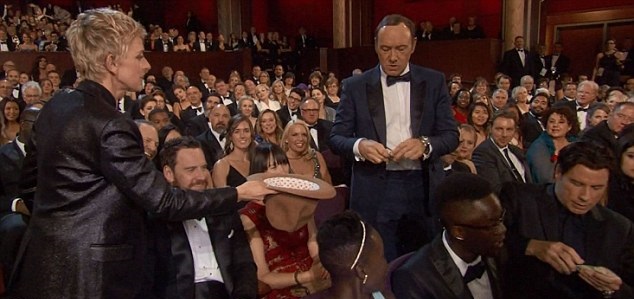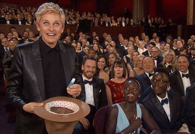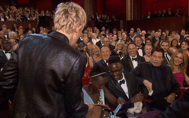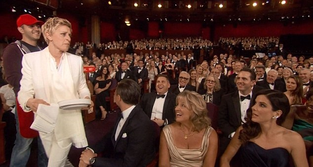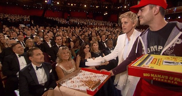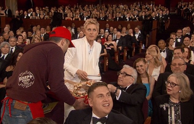 Apoi Edgar a urmat-o pe Ellen printre locurile din primul rând al sălii, unde aceasta a început să strângă, în pălăria cântărețului Pharell Williams, banii pentru cea mai faimoasă și amuzantă comandă de pizza. Printre cei care "au cotizat" s-a numărat și Brad Pitt. Ellen nu a precizat însă câți bani a strâns și ce s-a întâmplat cu ei.