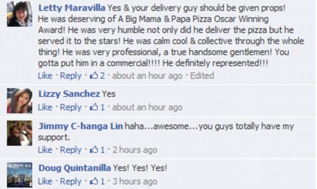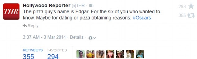"Nebunia" din sală nu s-a topit însă după încheirea galei. A doua zi, o mulțime de oameni au început să scrie pe Facebook și pe Twitter că au fost la "Big Mama's & Papa's Pizzeria" și l-au întâlnit pe tipul care a dus pizza la Oscaruri. Unii se mândreau că au comandat dintotdeauna de la el. Edgar a devenit vedetă.