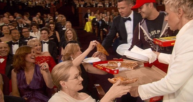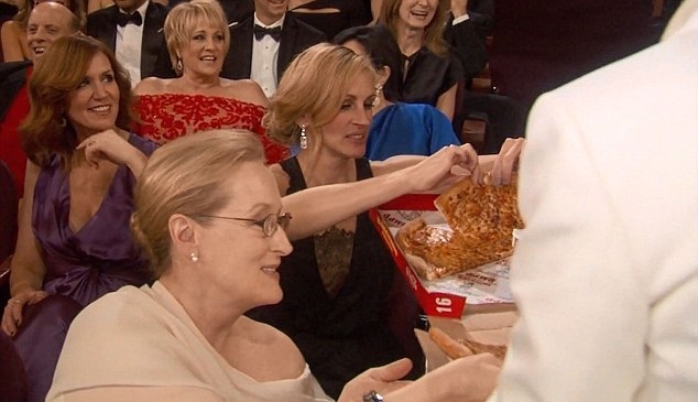 Îmbrăcată într-o rochie albă elegantă, Meryl Streep "a atacat" și ea o bucată, un moment surprinzător și interesant, pentru că nimeni nu se aștepta ca o ceremonie atât de bine programată, la care starurile se prezintă foarte elegant, actorii de top se vor linge pe degete după ce au mâncat feliile irezistibile de pizza.
