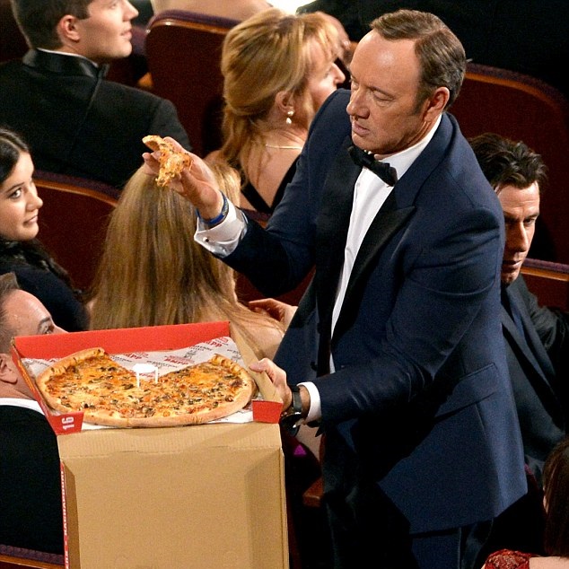 Kevin Spacey s-a dovedit și el un gentleman și a ajutat la împărțirea farfuriilor și a feliilor de pizza, apoi a mâncat și el o bucată.