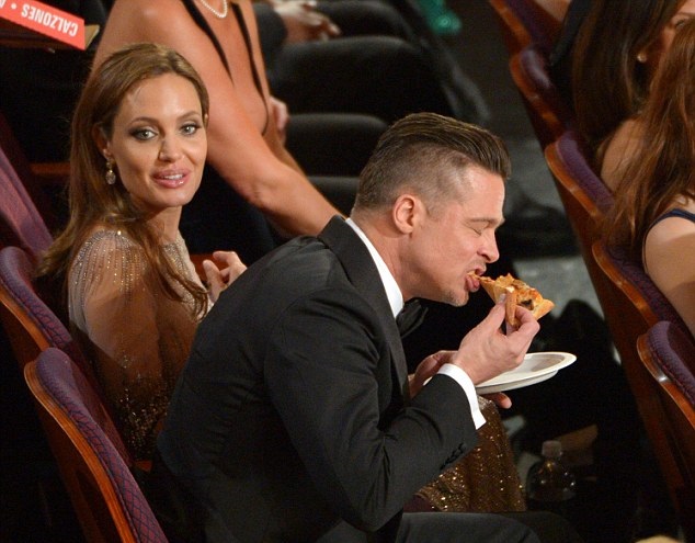 Brad Pitt a mușcat cu poftă dintr-o felie de pepperoni, după ce a oferit farfurii din plastic și șervețele doritorilor de lângă el. Logodnica lui își oprise și ea o farfurie, dar Ellen apucase deja să treacă mai departe și n-a observat-o, așa că Angelina Jolie a preferat să-l urmărească amuzată pe Brad cum înfuleca.