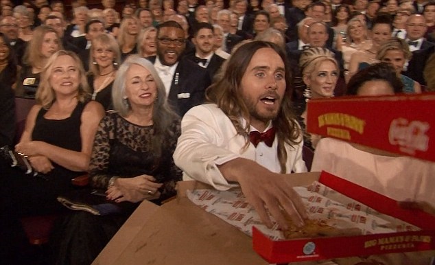 Gazda show-ului a mers apoi spre unul dintre laureații serii, Jared Leto, iar acesta a luat o felie de pizza pentru mama lui, aflată lângă el, căreia i-a adresat un mesaj emoționant de mulțumire de pe scenă, după ce a primit distincția pentru cea mai bună interpretare secundară masculină.