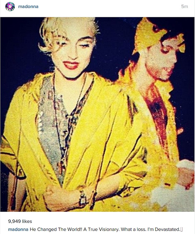 Prince a avut o scurtă relație cu celebra cântăreață, în 1985, în perioada în care ei au cântat în duet "Love Song". Ea l-a părăsit după ce l-a cunoscut pe Sean Penn, cu care s-a și căsătorit în acel an. Marți, Madonna a postat pe Instagram o fotografie cu Prince, în care amândoi erau îmbrăcați în galben. "A schimbat lumea!! Un adevărat vizionar! Ce pierdere. Sunt devastată", a scris ea.