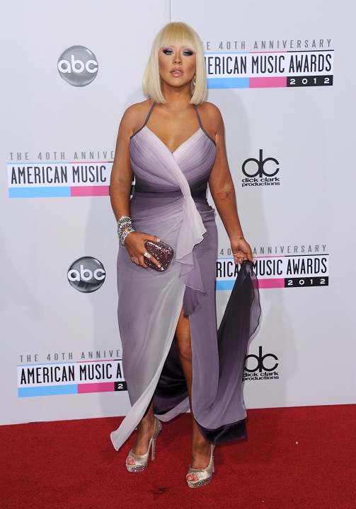 Christina a pășit pe covorul roșu al galei purtând o rochie lungă de culoarea liliacului, cu o despicătură generoasă, care nu reușea totuși să-i atenueze posteriorul foarte mare.