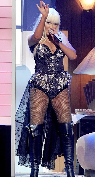 Cântăreața în vârstă de 31 de ani a urcat pe scenă îmbrăcată curajos, cu un corset negru presărat cu steluțe argintii și terminat la spate cu o trenă transparentă, ciorapi plasă și cizme negre peste genunchi.