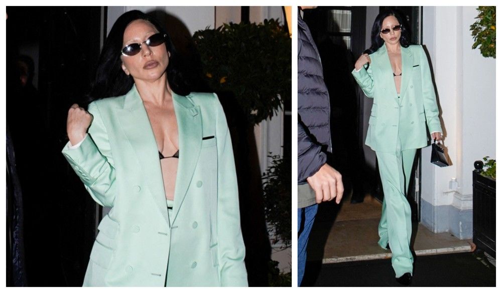 Hainele și stilul complet au fost pe măsură: o ținută mint-verde satinat, cu un sacou supradimensionat și un top negru la bază, sugerând un amestec de eleganță și intensitate.