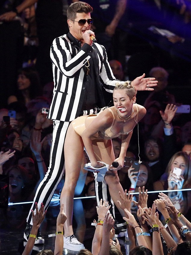Vedeta în vârstă de 20 de ani a șocat publicul și telespectatorii din primul moment în care și-a făcut apariția pe scenă. Purtând doar un sutien și bikini din latex de culoarea pielii, Miley Cyrus a dansat cu limba scoasă, făcând mișcări provocatoare alături de arătosul Robin Thicke, îmbrăcat într-un costum cu dungi verticale alb-negru. La un moment dat, ea a mimat un act sexual cu artistul în vârstă de 36 de ani, căsătorit cu Paula Patton.