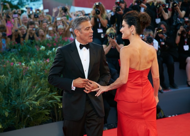 Prezenţi la Festivalul de Film de la Veneţia, unde au luat parte la premiera thriler-ului "Gravity", cei doi actori au format o pereche irezistibilă. Ei au fost în centrul atenţiei, dar asta nu l-a împiedicat pe George să-i pună mâna pe fund Sandrei, în timp ce o conducea pe covorul roşu.