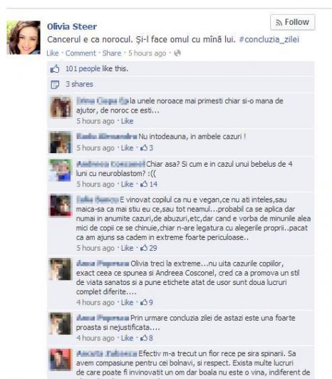 Olivia Steer a comis o imprudenţă care ar putea s-o coste, cel puţin în privinţa imaginii. Ea a scris marţi, pe pagina sa de Facebook, un mesaj bizar: "Cancerul e ca norocul. Şi-l face omul cu mâna lui".