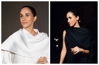 Meghan a ales două look-uri semnificative: unul all-white cu detalii spectaculoase, altul într-un negru elegant, mai restrâns, dar cu prezență.