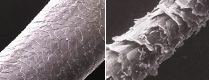 Fir de păr sănătos (stânga) şi fir de păr degradat (dreapta)