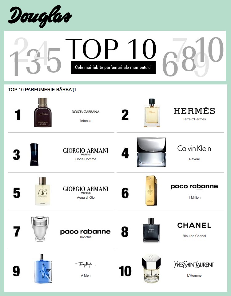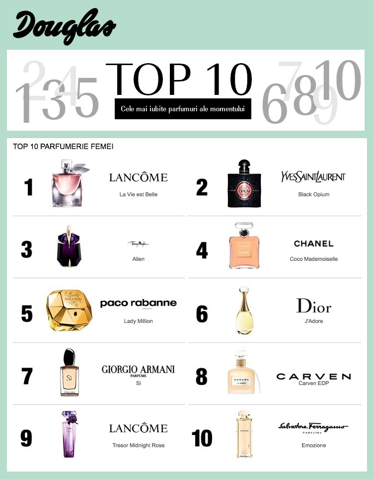 Principalul segment de produse comercializat de Douglas este cel de parfumerie, majoritatea clienților optând pentru acest tip de achiziții.Douglas realizează un top lunar al preferințelor clienților în această zonă, iar în luna martie, în cazul parfumurilor pentru femei, pe locul unu s-a clasat parfumul La vie est Belle de la Lancome, pe locul doi Black Opium de la Yves Saint Laurent, iar pe locul trei Alien de la ThierryMugler. În topul parfumurilor pentru bărbați, pe locul unu se regăsește Intenso de la D&G, pe locul doi, Terre d’Hermes de la Hermes iar pe locul trei Code Homme de la Giorgio Armani.