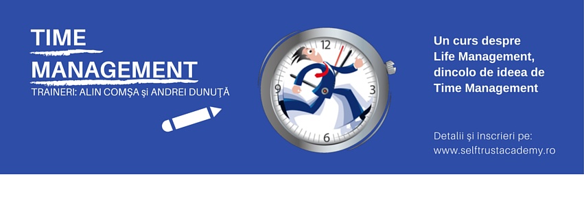 Pe 29 ianuarie, de la ora 18:30, compania de training Self Trust Academy va invita la un curs atipic de Time Management, un curs despre cum sa ai grija de cea mai pretioasa resursa pe care o ai la dispozitie: timpul. Un curs despre Life Management, dincolo de ideea de Time Management. Si asta pentru ca, de fapt, nu poti controla timpul. Ce poti face, in schimb, este sa-ti gestionezi actiunile si prioritatile.