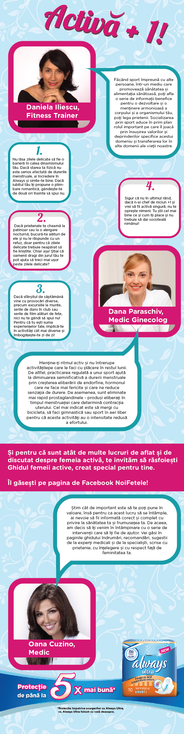 Așadar, fie că alegi să fii activă alături de jumătatea ta, fie că alegi să faci mișcare alături de un prieten sau de un membru al familiei, află că activitatea în doi este mult mai distractivă și poate da rezultate chiar mai bune. Și ca să nu-ți faci griji pentru zilele delicate, trebuie să știi că Always susține femeile active, oferindu-le siguranța și confortul de care au nevoie. Nu uita că Always Ultra asigură protecţie împotriva scurgerilor de până la 5 ori mai bună decat Always Ultra folosit cu vată deasupra.