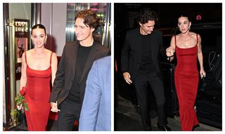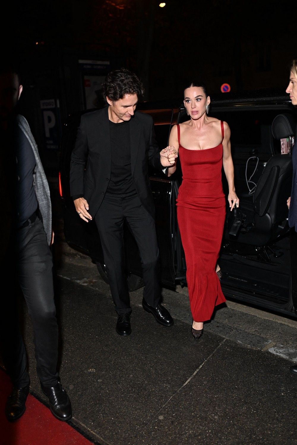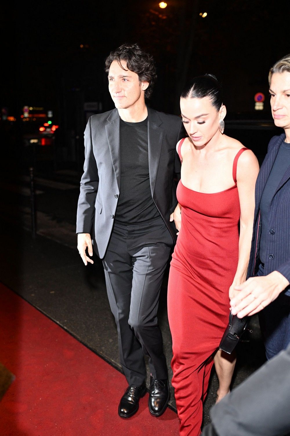Katy a optat pentru o rochie roșie vibrantă, simbol al senzualității și al energiei, în timp ce Justin a ales o ținută clasică, complet neagră, echilibrând apariția prin sobrietate.