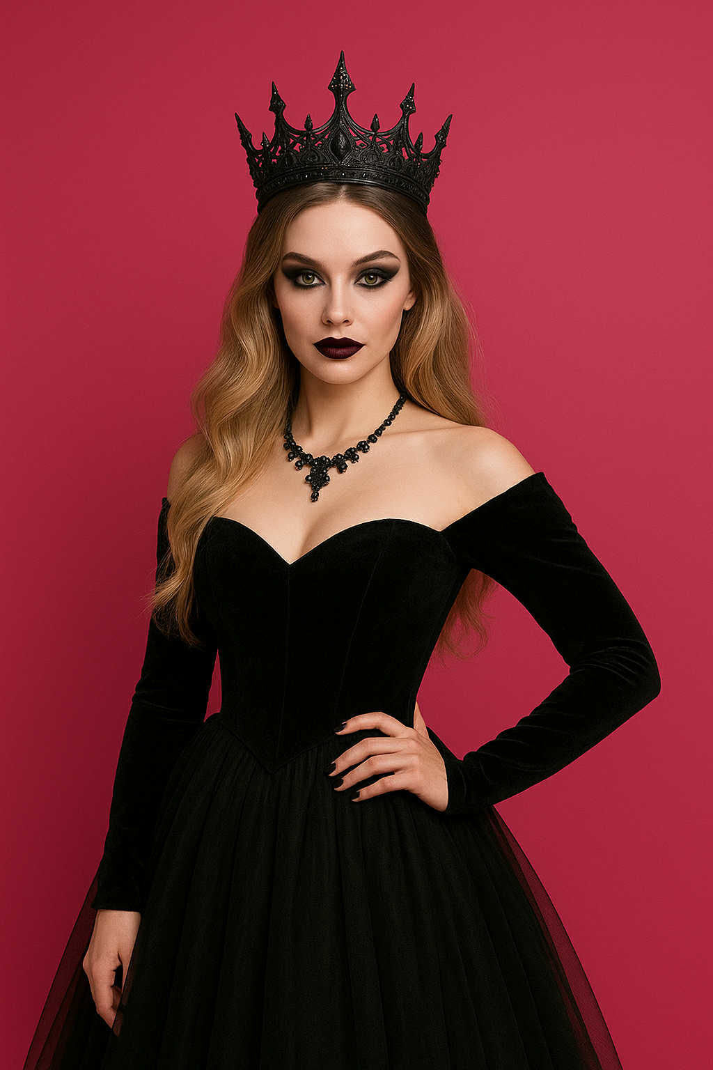 - Regina întunericului: o rochie neagră, coroană gotică și machiaj intens.